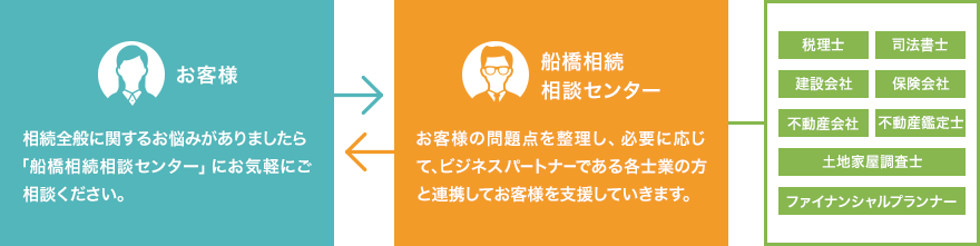 相続に関する手続きや対策は多岐にわたり、税理士、弁護士、司法書士、行政書士、不動産鑑定士等の士業や不動産、保険、遺品整理など、バラバラに頼んでしまうと、煩雑になってしまう作業も、船橋・津田沼相続相談センター(運営:一般社団法人 千葉県相続相談協会・行政書士イーライフパートナーズ)にご相談頂ければ、窓口を1つに絞ることが出来ます。相続のスペシャリストを集めた専門家チームで対応しますので安心してご相談頂けます。